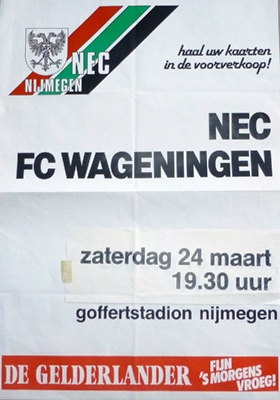 Het gekke van dit en hieronder vermelde affiches is, dat er wel een datum maar geen jaartal op staat. Al deze affiches werden gedrukt bij een drukkerij in Overasslt waar helemaal niets meer van terug te vinden is. Buiten het affiche NEC - FC Wageningen heb ik ook nog: NEC - MVV ( 24-10-1981 / 2-1 ) / NEC - Willem II ( 11-11-1981 / 0-4 ) / NEC - AZ '67 ( 06-04-1082 / 0-3 ) / NEC - Ajax ( 13-12-1990 / 1-2 / NEC - FC Den Haag ( 20-12-2008 / 0-0 ) en NEC - GA Eagles ( 31-10-2015 / 0-1 ).