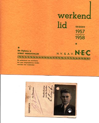 Diploma van Cees Cuijten als werkend lid, seizoen 1957 - 1958 alsmede vrij vervoerskaart met pasfoto voor de gemeente tram 1947 - 1948.