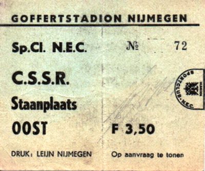Sportclub NEC - C.S.S.R. / Sportclub NEC - Zilina / 28-06-1969 / 1-1. Het betreft hier een ticket van de intertoto wedstrijd tegen Zilina uit de C.S.S.R. ( het toenmalige Tjechoslowakije ). Vermoedelijk had de drukkerij Leijn uit Nijmegen op het ticket moeten vermelden Zilina uit de C.S.S.R. Met dank aan de Heer Gijsbert van Heijst die het mij in 01-2020 ter beschikking heeft gesteld.