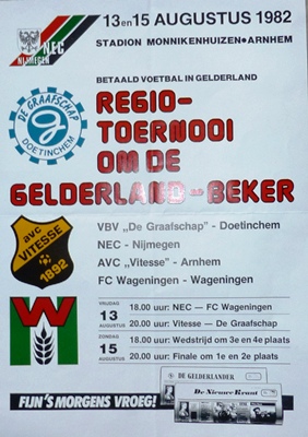 Erg mooi affiche van de Gelderland beker waarvan de wedstrijden werden gespeeld op 13 en 15 augustus 1982. Deelnemende teams waren NEC - de Graafschap - Vitesse en FC Wageningen. Vitesse en NEC speelden de finale op 15-08-1982, uitslag 3-3. NEC won de beker na strafschoppen.